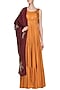Featuring a mustard anarkali in cotton satin base with pita embroidery on the front yoke . It is paired with maroon dupatta in cotton satin with pita tropical floral embroidery butta done all over.