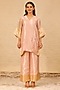 Featuring a pink short kurta in silk tissue base with a v-neckline. It is paired with high-waisted pants. Accentuate it with statement earrings and heels for a perfect festive ready-look.