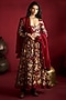 Featuring a maroon anarkali in silk base with handpaint and embroidery. It is paired with pants and an organza dupatta. Accentuate it with statement jewellery and block heels for festive occasions, weddings or engagement ceremonies.