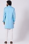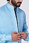 Featuring a cyan blue long bundi jacket in poly dupion base with stripes. Perfect for a festive occasion or pooja ceremony.
