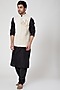 Featuring a white and gold bundi jacket in linen base with thread embroidery. Perfect for a festive occasion or wedding ceremony.