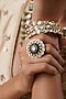 Featuring a gold finish handcrafted ring studded with kundan polki and green stones, set in mixed metal. It has an adjustable closure. Ideal for festive occasions, weddings, or elevating your elegant evening look.