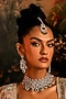 Featuring a white rhodium finish choker necklace studded with emerald and australian swarovski diamonds, set in mixed metal. It is paired with a matching pair of earrings. Ideal for festive occasions or wedding celebrations.