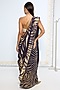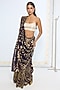 Featuring a black and gold handwoven saree in silk base with zari stripes woven in the kadwa technique and an attached blouse piece. Accentuate it with polki earrings and heels for a festive occasion.