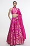 Featuring a fuchsia banarasi lehenga in pure satin silk base with handwoven cutwork. It is paired with a blouse having halter neckline and a dupatta. Accentuate it with statement earrings, hair accessories or a potli bag, perfect for weddings and celebrations where you want to make a statement.