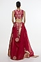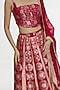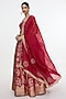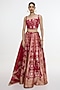 Featuring a ruby red lehenga in pure satin silk base with handwoven kadhwa banarasi technique. It is paired with a corset blouse and a dupatta. Accentuate it with statement earrings, hair accessories or a potli bag, perfect for weddings and celebrations where you want to make a statement.