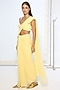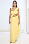 Featuring a yellow saree in pure chiffon base with a gold hardware brooch and an attached blouse piece. Accentuate it with silver earrings and heels for a festive occasion.
