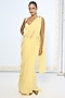 Featuring a yellow saree in pure chiffon base with a gold hardware brooch and an attached blouse piece. Accentuate it with silver earrings and heels for a festive occasion.