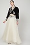 Featuring a black short jacket in velvet base with zardosi embroidery. It is paired with a contrasting white organza skirt and a belt.