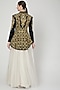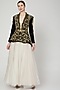 Featuring a black peplum jacket in velvet base with zardosi embroidery. It is paired with a matching belt.