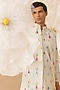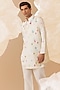Featuring an off-white nehru jacket in silk base with mirror embroidery. It is paired with a kurta and pants. Style it with kolhapuri sandals for a festive gathering, sangeet and engagement ceremony.