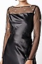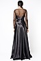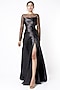 Featuring a black dress in satin and net base with embellishments, side slit, and a cowl neck.