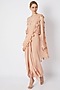 Featuring a dusty pink skirt saree in modal silk base. It is paired with a matching double peplum top having metallic embroidery and tassels including a shimmery dupatta.