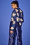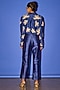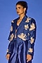 Featuring a blue cropped blazer in silk base with tissue floral embroidery. It is paired with pleated pants and a bralette. Accentuate it with statement earrings and heels for an indo-western look.