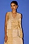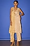 Featuring a gold sleeveless jacket in pure tissue base with patch work and hand embroidery. It is paired with long half and half kurta and pants. Accentuate it with statement earrings and heels for an indo-western look.