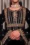 Featuring a black kaftan in velvet base with bell sleeves, side slit and embellishments. Accentuate it with dangler earrings, sleek bun and heels for a festive occasion, cultural event or sangeet ceremony.