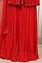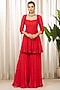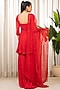 Featuring a red peplum top in semi-crepe and georgette base with aari, resham and dori hand work. It is paired with sharara pants and an organza embellished dupatta. Accentuate it with statement jewellery and heels for festive occasions or weddings ceremonies.
