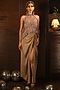 Featuring a nude bralette in french crepe base. It is paired with a french crepe sarong skirt and a net embroidered asymmetric halter top. Accentuate it with statement earrings, a clutch and block heels for cocktail parties.