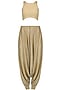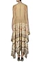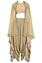 This set features a gold front open long jacket in georgette and hosiery base with multicolor floral thread emrboidery all over paired with matching pleated dhoti pants.