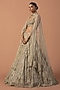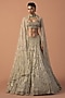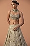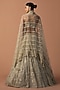 Featuring a gold lehenga in tulle base with 3D embroidery. It is paired with a blouse having mirror work and a dupatta. Elevate this designer ensemble with diamond jewellery and embellished block heels for a striking look, perfect for cocktail nights, weddings or engagement ceremonies.
