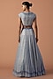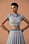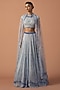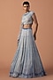 Featuring a grey lehenga in silk organza and tulle base with swarovski stones and bugle beads embroidery. It is paired with a blouse having a high neckline and a dupatta. Elevate this designer ensemble with diamond jewellery, a floral hairdo, and embellished block heels for a striking look, perfect for weddings or engagement ceremonies.