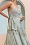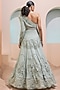 Featuring a mint green lehenga in georgette base with cutwork. It is paired with a matching cross over jacket and a beaded corset.