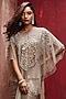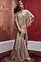 Featuring a nude draped saree in tulle and georgette base and bugle beads and 3D floral embroidery. It is paired with a beaded blouse and a tulle cape. Accentuate with statement jewellery and heels for a wedding, sangeet or engagement ceremony.