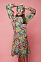 Featuring a multi-colored wrapped mini dress in crepe base. It is paired with a matching belt.