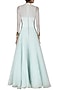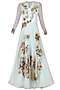 Featuring an aqua bouffant gown in organza and pure silk base with georgette sleeves and multi-color floral applique work.