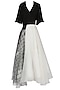 Featuring a black and white asymmetrical bouffant gown in georgette and organza base with embroidered beads and macrame detailing.