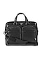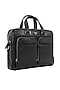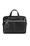 Featuring a black laptop bag in leather base with multiple compartments and pockets. It has a polyester lining.