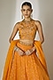 Featuring an orange lehenga in viscose organza base with an attached cancan, bukram, sequins jaal pattern and mirror embellishment. It is paired with a halter neck blouse having attached cups and a dupatta. Accentuate it with statement earrings and heels for weddings or sangeet ceremonies.