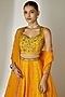 Featuring a yellow and orange lehenga in viscose organza base with an attached cancan, bukram, sequins jaal pattern and mirror embellishment. It is paired with a yellow sleeveless sweetheart neckline blouse having attached cups, and an orange dupatta. Accentuate it with statement earrings and heels for weddings or sangeet ceremonies.