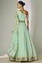 Featuring a mint green lehenga in viscose organza base with an attached cancan, bukram, sequins jaal pattern and mirror embellishment. It is paired with a one-shoulder blouse having attached cups and cape sleeves on one side. Accentuate it with statement earrings and heels for weddings or sangeet ceremonies.