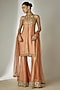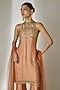 Featuring a rust orange kurta in crushed silk tissue base with sequins, kundan and glass bead hand embroidery, complemented with a halter neckline. It is paired with a kalidar sharara and a net dupatta. Accentuate it with statement jewellery, block heels and a potli bag for festive occasions, sangeet or wedding ceremony.