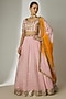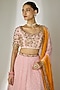 Featuring a pink lehenga in viscose organza base with an attached cancan, bukram, sequins jaal pattern and mirror embellishment. It is paired with a sweetheart neckline blouse having attached cups, and an ombre pink dupatta. Accentuate it with statement earrings and heels for weddings or sangeet ceremonies.