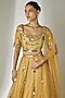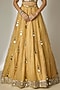 Featuring a gold lehenga in crushed silk tissue base with rhinestones and mirror hand embroidery. It is paired with an embroidered blouse, a net dupatta and a cancan skirt. Accentuate it with statement earrings and heels for weddings or sangeet ceremonies.