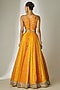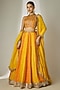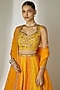 Featuring an orange and yellow lehenga in viscose organza base with an attached cancan, bukram, sequins jaal pattern and mirror embellishment. It is paired with a halter neck blouse having attached cups and a dupatta. Accentuate it with statement earrings and heels for weddings or sangeet ceremonies.
