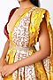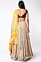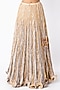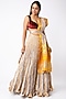 Featuring a gold-silver and copper lehenga in tissue base with metallic work. It is paired with a contrasting blood red velvet blouse and a gajji silk dupatta having bandhani, gota, and zardosi embroidery. This contains only three pieces.