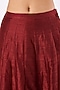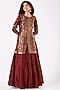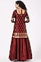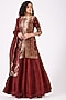Featuring a deep red top in banarasi silk base with zari, gota, and mukaish embroidery. It is paired with a matching raw silk lehenga and a chanderi dupatta.