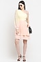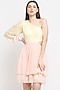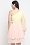 Featuring a blush pink and yellow one-shoulder dress in crepe base with side cut-out and layered flounce.
