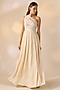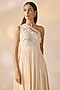Featuring an ivory gown in georgette satin base with hand embroidery and pleated trail. Style it with zircon earrings and stilettos for evening soirees or cocktail parties.
