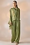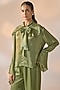 Featuring an olive green top in sheer base with tie-neck bow detail. It is paired with straight pants having elasticated waistband. Accentuate it with zircon earrings and block heels for evening soirees or cocktail events.