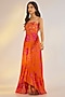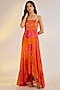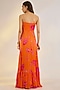 Featuring an orange ruffled dress in georgette satin base with digital print and hand embroidery. Accentuate it with statement earrings and heels for a party or beach wear.
