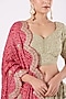 Featuring a beige and gold lehenga in silk crushed base. It is paired with a matching embroidered blouse and a bandhani dupatta.