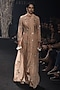 This set features a dusty pink organza trench coat with floral hand embroidery all over paired with dupion crop blouse, dhoti pants and mukaish work dupatta.