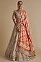 Featuring a golden lehenga in tissue base. It is paired with a blouse and an orange dupatta. Accentuate with statement earrings and heels for a wedding or engagement ceremony.