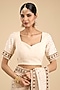 Featuring an ivory saree in chikankari base with mukesh work. It is paired with an embroidered blouse. Accentuate it with kundan or meenakari jewellery, a sleek floral hairdo and block heels for a complete look, perfect for wedding, sangeet or engagement ceremonies.