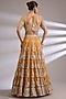 Featuring a mustard lehenga in net and habutai crushed base with embroidery. It is paired with a silk habutai embroidered blouse and a banarasi tissue dupatta. Accentuate it with kundan polki jewellery, a floral hairdo, block heels and a potli bag for a complete look, perfect for wedding or engagement ceremony.