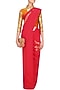This set features a red muga silk banarasi saree paired with rust orange hand embroidered gota patti work stiched blouse.